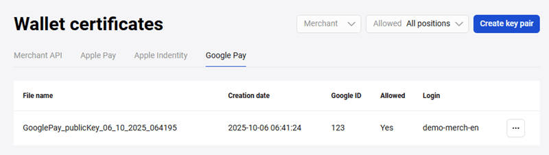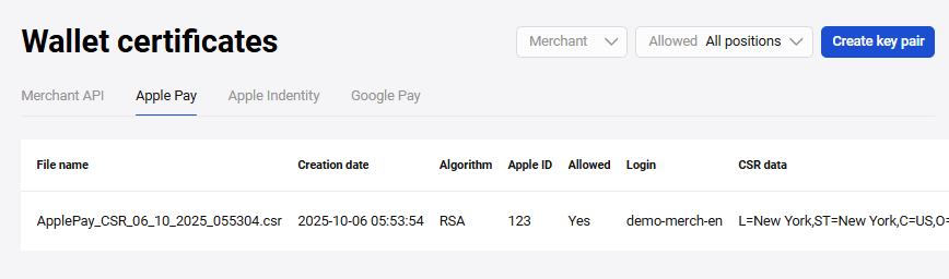 The created key pair will be displayed in the Apple Pay tab (see the figure below).