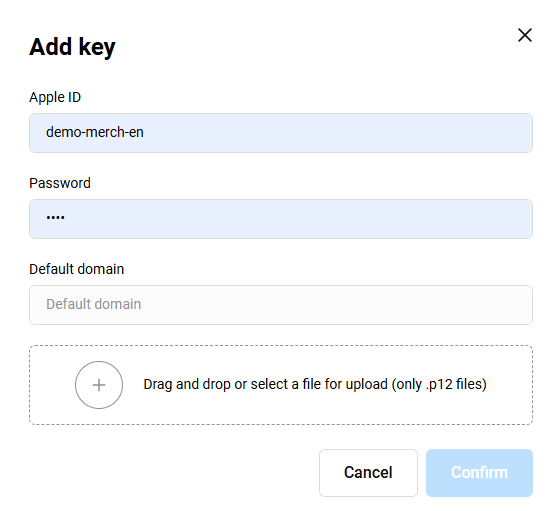 - Apple ID - enter your Merchant Apple ID.