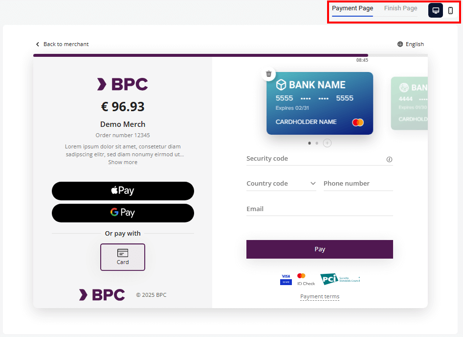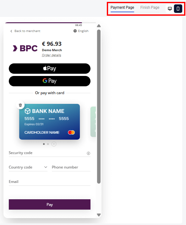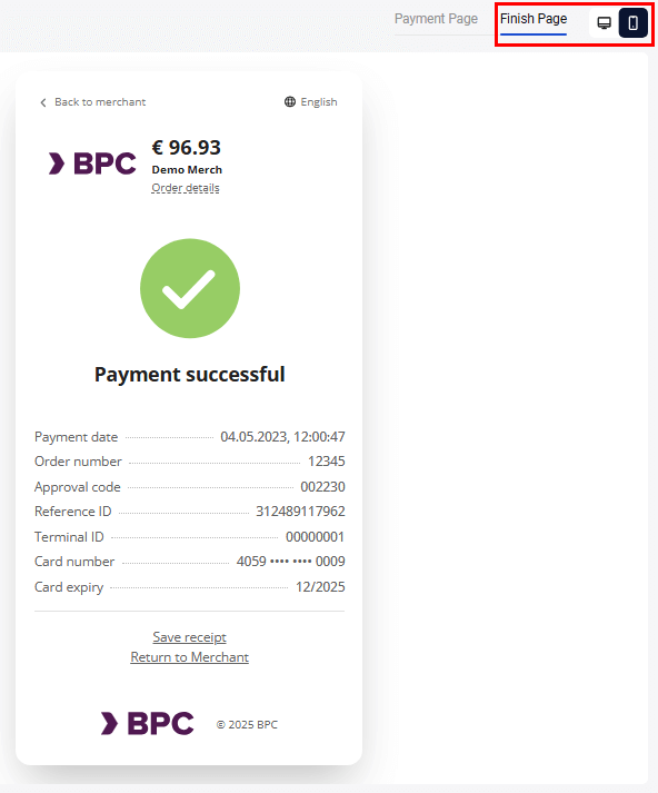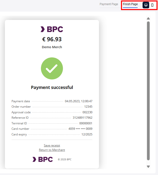 At the top of the page you can choose the format of the payment page display: desktop or mobile.